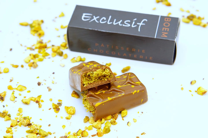 Deliciul suprem al verii - aromele Dubai-ului la tine acasa: baton din ciocolată cu lapte alături de o umplutură crocantă, plină de fistic. Realizat din fistic Bronte 100% și cataif prăjit în unt, un duo suprem de arome și răsfaț. Acum si fara zahar adaugat, cu indulcitor Dulcisor by Sweeteria.