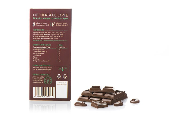 Zică lumea ce-o vrea, unii s-au obișnuit din copilărie cu ciocolata cu lapte. Alții sunt acum copii și aromele dulci de lapte și caramel, condimentate cu doar puțină cacao, sunt tot ce-i fce fericiți. Pentru ei am creat cel mai blând produs al nostru, fin, delicios și seducător ca o invitație de a (re)deschide cartea cu povești a copilăriei: ciocolata cu lapte îndulcită cu nectat de agave. Zahăr nu am pus niciun strop,deoarece noi, la Sweeteria, folosim numai îndulcitori naturali! Nectarul de avage provine dintr-oi plantă formidabilă din Mexic, din familia cactușilor. Este un sirop dens și foarte gustos, care conferă ciocolatei noastre o undă de caramel care te va face să mai ceri încă o bucată! Deși nectarul de agave conține calorii, ele sunt mult mai puține și ca urmare întregul produs va avea un impact caloric mai redus decât o ciocolată cu lapte standard și spun clienții…. muuuult mai bună!
