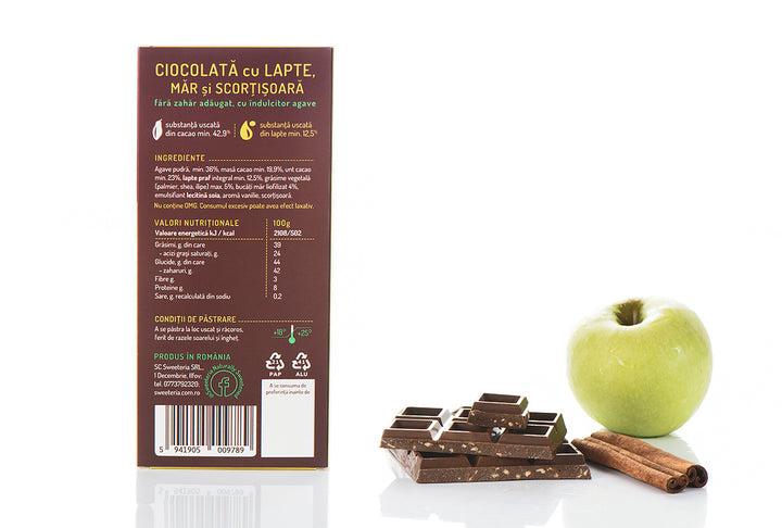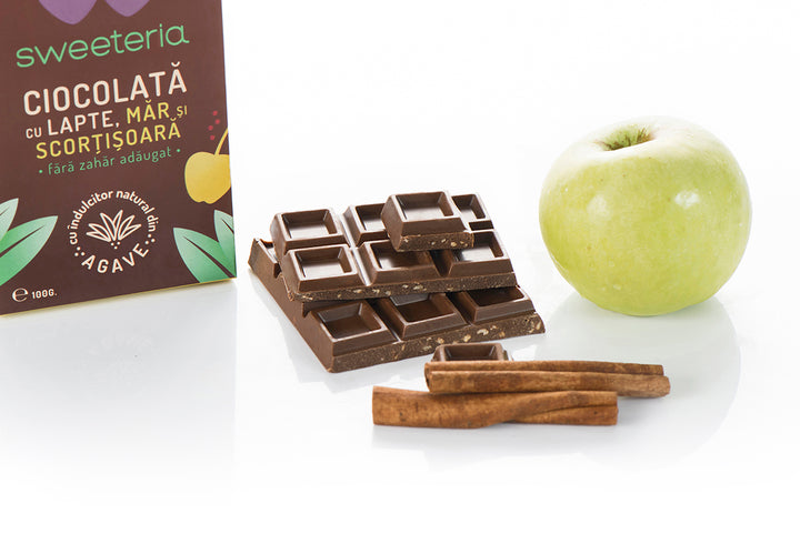 Ciocolată caldă, scorțișoară și parfum de măr copt: esența moale, tandră și mângâietoare a iernii ne este acum la îndemână în orice anotimp, grație ciocolatei solide de la Sweeteria. Dorința de a te cuibări la gura sobei este o năzuință a sufletului către puritate și iubire și este prezentă indiferent de ce ne arată calendarul și chiar termometrul. Acum putem avea mereu aproape și la îndemână senzația aceasta de copilărie, pentru că există ciocolata cu lapte cu măr și scorțișoară de la Sweeteria. Pentru căe de la Sweeteria, ea nu mai are, desigur, niciun fir de zahăr adăugat, ci am folosit, așa cum obișnuiesc cofetarii noștri creativi, un îndulcitor natural. În acest caz este vorba de nectarul pur de agave. Deși acest îndulcitor are un număr redus de calorii, el prezintă avantajul de a fi foarte gustos, conferind ciocolatei acea aromă de caramel menită să te facă să exclami: I-RE-ZIS-TI-BIL!