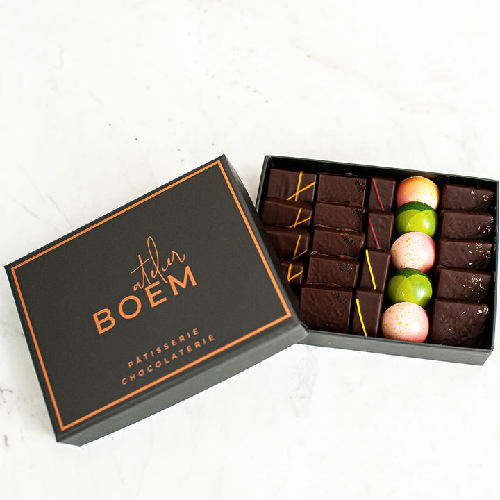 Conține 24 praline: Fructul Pasiunii, Vanilla Tahiti, Lămâie, Zmeură, Piersică-Mentă,  Caramel Lime, Mentă Maroc.