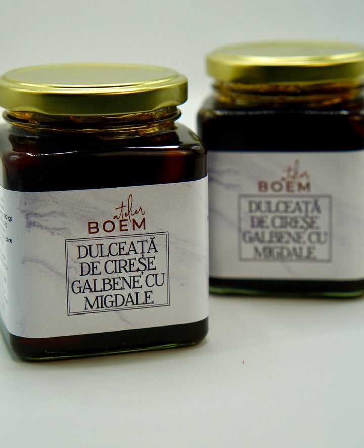 Clasicul incontestabil, cerut de numeroase rețete din arsenalul bunicilor, dar și din fluxul instagramistic, dulceața de cirese trece drept piatră de încercare pentru îndemânarea fiecărui producător, de la gospodinele cele mai pricepute până la influenceri și bloggeri de mare faimă. Totuși, noi vă spunem că suntem hors concours, deoarece noi, la Boem Atelier, am trecut la nivelul următor: am produs dulceața de cirese galbene în varianta gourmet, adaugand migdale.