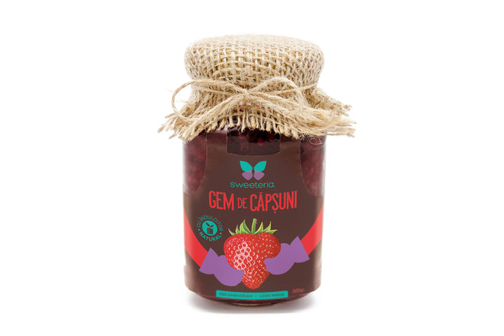 Cui nu-i i-e dor iarna de niște minunate clătite cu gem de căpșuni??? Pregătește-te însă pentru o experiență inedită deoarece gemul de capsuni cu indulcitor natural Sweeteria are un gust intens și pur, care te duce cu mintea mai degrabă la căpșunile proaspete decât la ceea ce cunoaștem ca gem de căpșuni cu zahăr! Asta pentru că noi, cei de la Sweeteria, nu fierbem căpșunile cu orele în zahăr, ci le fierbem rapid și responsabil și asezonăm gemul cu îndulcitorul nostru special, 100 % natural și 100 % fără calorii, care conține numai extract de stevia rebaudiana și eritritol din porumb nemodificat genetic. Ca urmare, îți oferim o întreagă plăcere a gustului fără mustrările de conștiință care te amenințau de fiecare dată când te dedulceai la borcanul de dulceață obișnuită cu zahăr! Fără pericol alergic deoarece folosim la fiert numai vase de inox alimentar, non-alergic (fara nichel/mangan). Fără pericol pentru glicemie și fără pericol de îngrășare. Existâ numai un singurl pericol cu gemul de capsuni cu indulcitor natural Sweeteria: că borcanul se va termina prea repede!