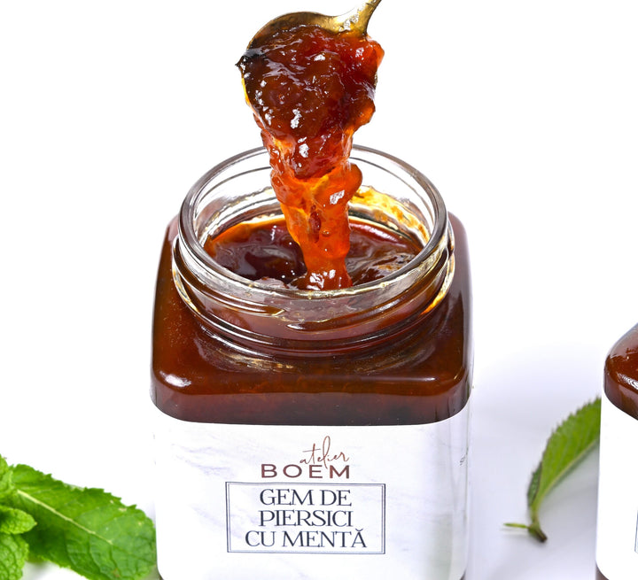 Clasicul incontestabil, cerut de numeroase rețete din arsenalul bunicilor, dar și din fluxul instagramistic, dulceața de piersici trece drept piatră de încercare pentru îndemânarea fiecărui producător, de la gospodinele cele mai pricepute până la influenceri și bloggeri de mare faimă. Totuși, noi vă spunem că suntem hors concours, deoarece noi, la Boem Atelier, am trecut la nivelul următor: am produs dulceața in varianta gourmet, infuzand preparatul cu frunze proaspete de menta.