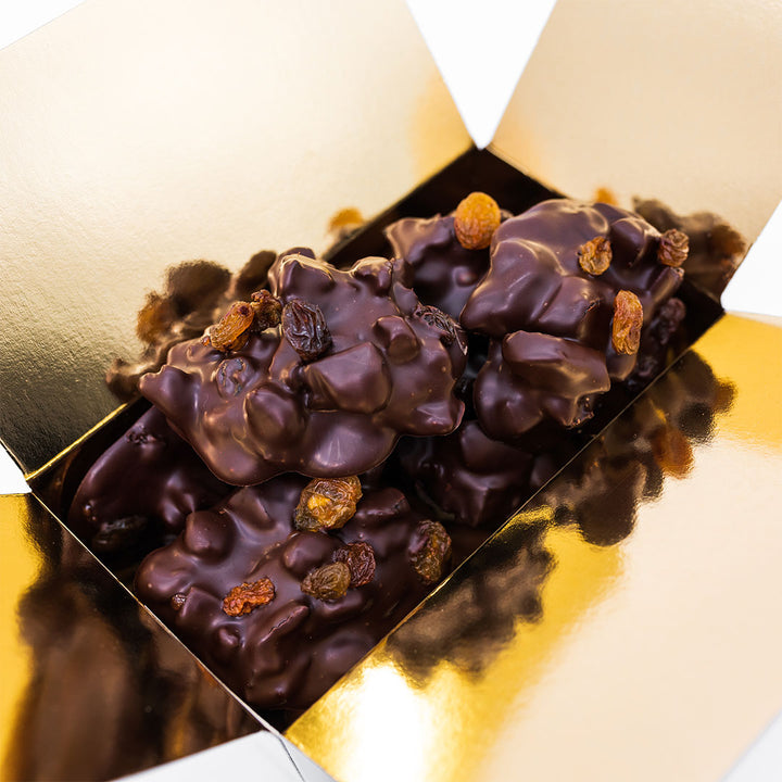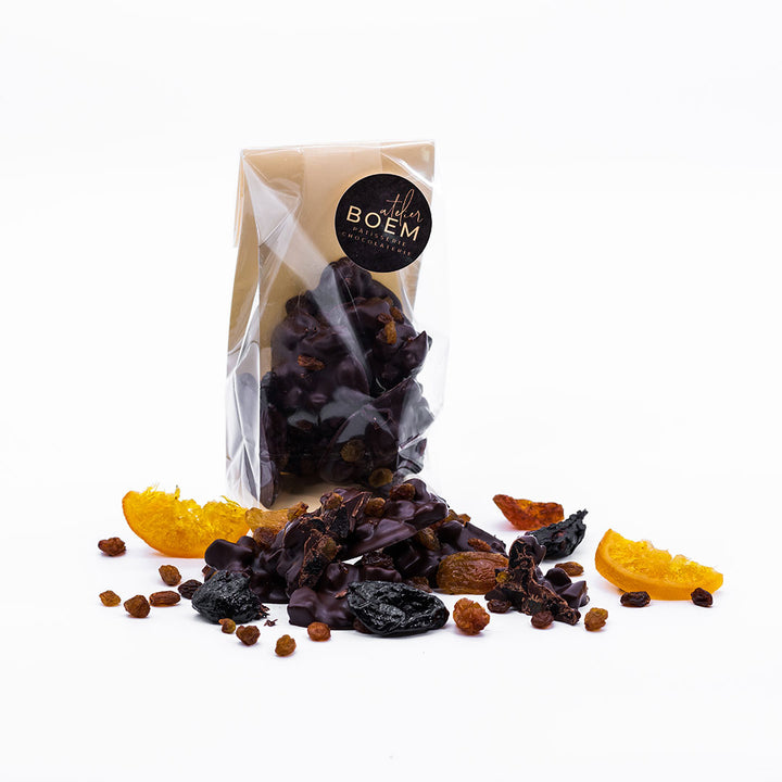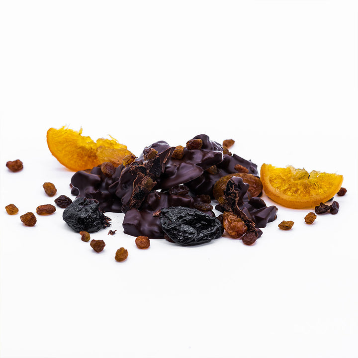 Bucăți de prună confiată și merișoare, cu puțină scorțișoară și ciocolată neagră.