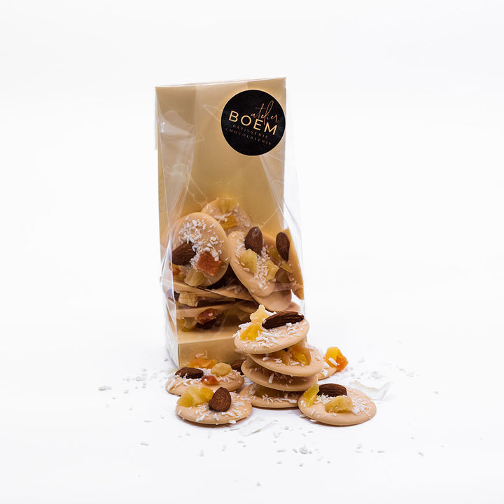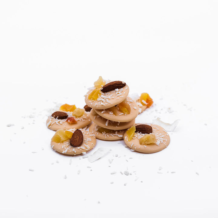 Bănuți de ciocolată albă lăptoasă, cu un mix exotic de migdale coapte, fulgi de cocos și fructe tropicale confiate.