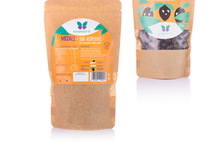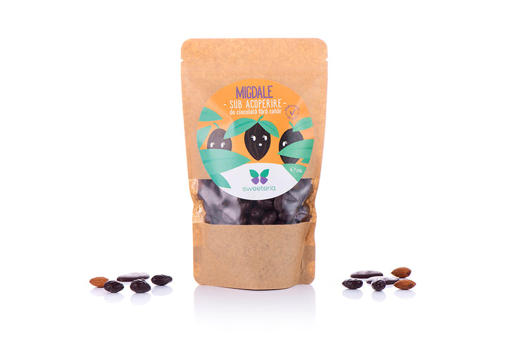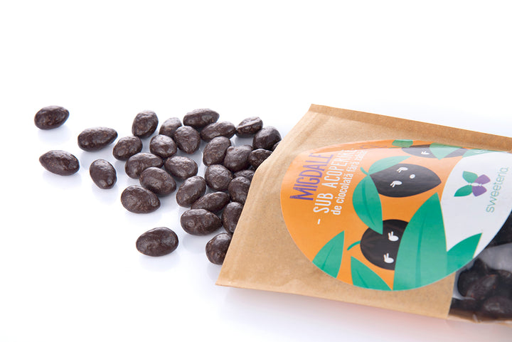 Agenți ai plăcerii… sub acoperire! Migdalele delicioase sunt acoperite de un strat generos de ciocolată care le completează gustul…. fără însă nicio grijă calorică, deoarece este vorba despre ciocolată creată în laboratoarele Sweeteria, deci fără strop de zahăr! Ciocolata lucioasă care învelește migdalele noastre este îndulcită numai cu Dulcișor pe bază de stevia rebaudiana și eritritol din porumb nemodificat genetic, așa că vei avea parte de o gustare 100% naturală și 100% vegană, numai bună pentru o zi de post. Știai că migdalele te fac mai iute în gândire și îmbunătățesc memoria și echilibrul psihic? Află acum că în combinație cu efectul mobilizator și energizant al ciocolatei ele devin gustarea ideală pentru oricine are nevoie de concentrare și antren pentru câteva ore de școală sau pentru o seară de muncă intelectuală intensă! Datorită ciocolatei Sweeteria aportul caloric este moderat în raport cu migdalele în ciocolată obișnuită!