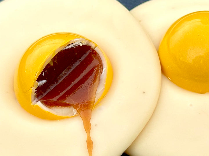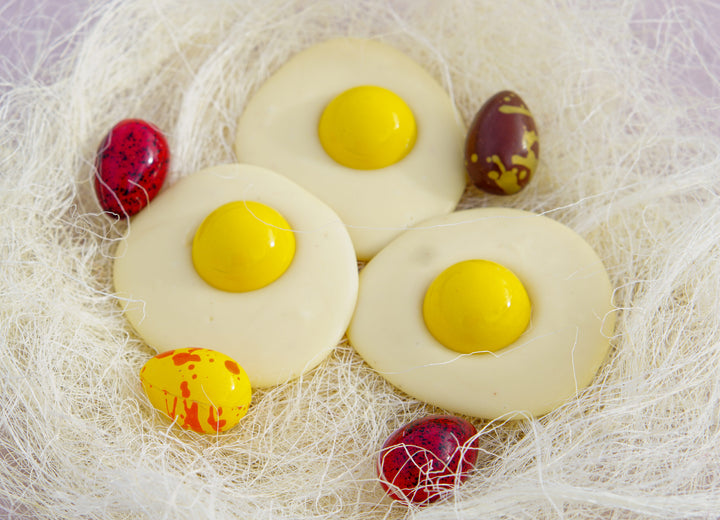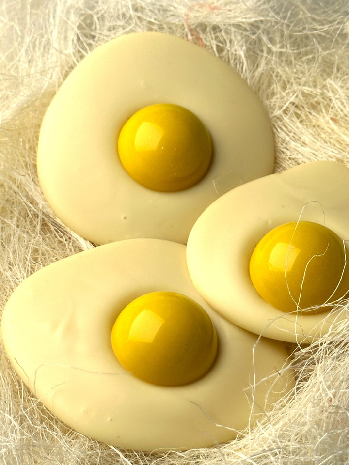 Cutia cu 3 oua "ochiuri" din ciocolata alba cu insert de caramel, mango si fructul pasiunii reprezinta cadoul perfect pentru gurmanzi, de Paste.