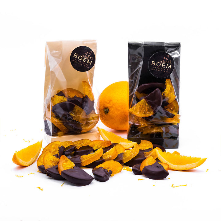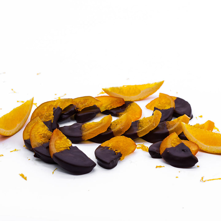 Un balans atent între dulce și amărui, aceste felii de portocală confiată reprezintă un clasic al oricărei ciocolaterii. Îmbăiate într-un sirop de zahăr aromat pentru două săptămâni, până devin moi și translucide, gustul amărui este ameliorat încet de dulce, conturându-se armonia perfectă.