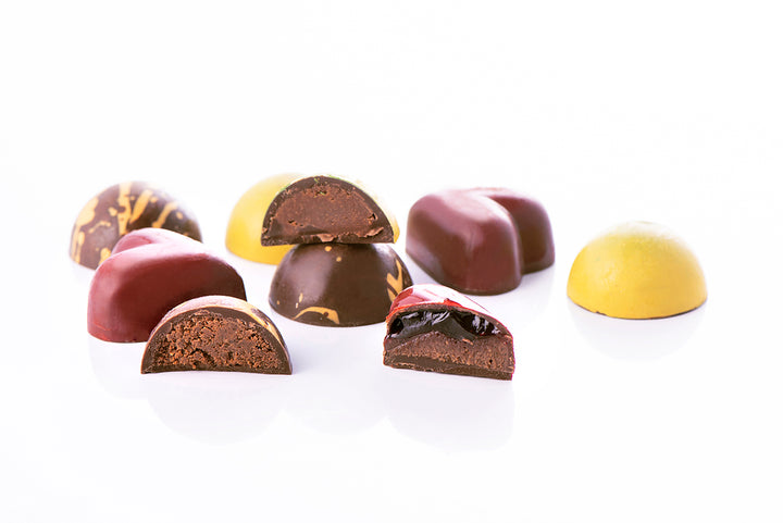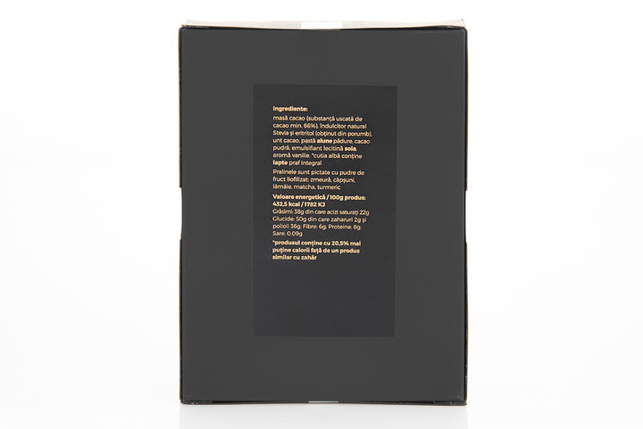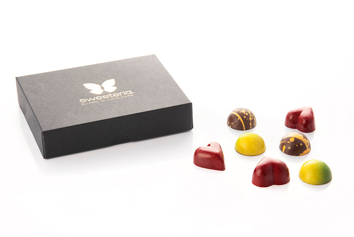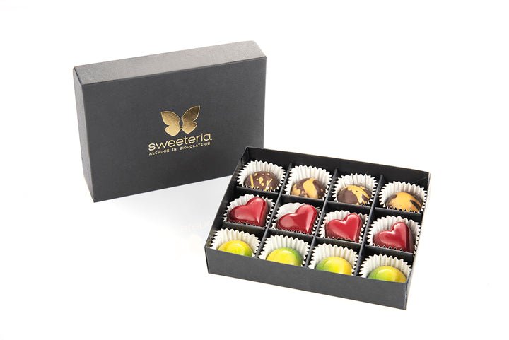 Prima gamă de praline artizanale Sweeteria, realizată din ciocolata belgiana fara zahar, conține 12 bijuterii din ciocolată, configurate astfel: ciocolată amăruie vegana cu umpluturi din Greentella (cremă de ciocolată fără zahăr Sweeteria), alune coapte, jeleu de sfecla roșie, pudră și bucăți de lămâie liofilizată. Pictura pralinelor este realizată cu unt de cacao și pudre de fruct, legume liofilizate și condimente: sfeclă, matcha, turmeric.