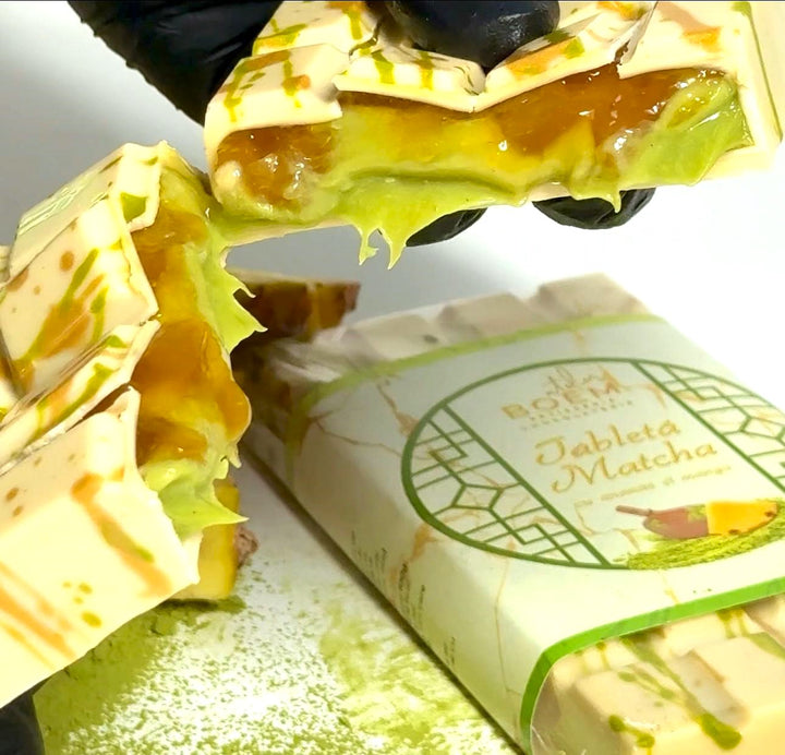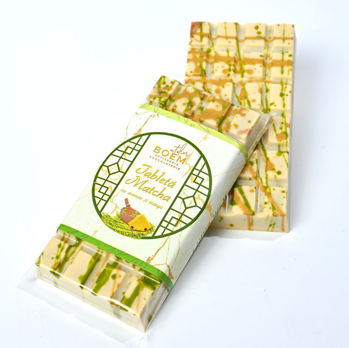 Tabletă compusă dintr-o marmelada parfumată acrișoară de ananas, un ganache cu mult ceai verda Matcha Premium Grade, alături de ciocolata albă belgiană.