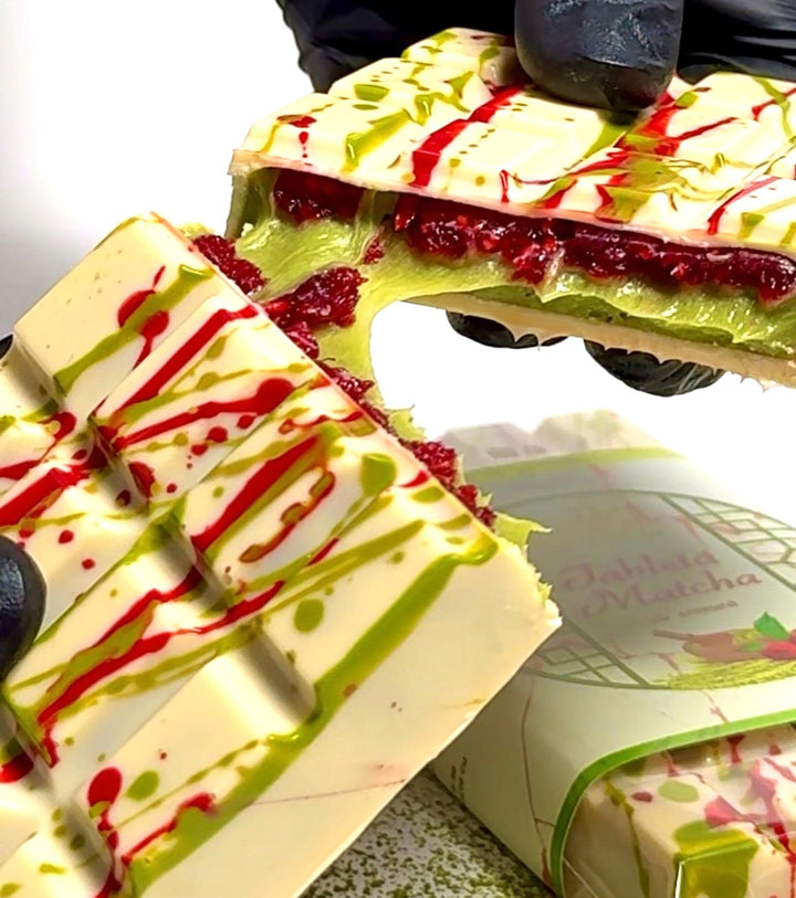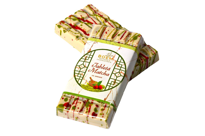 Tabletă compusă dintr-o marmelada parfumată de zmeură, un ganache cu mult ceai verda Matcha Premium Grade, alături de ciocolata albă belgiană.