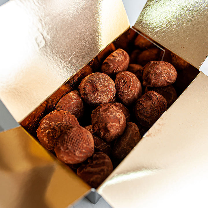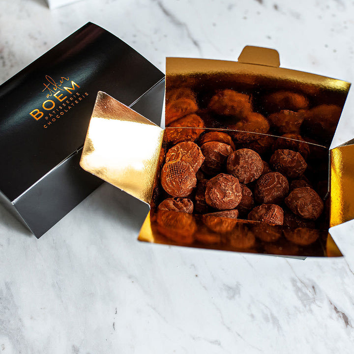 Un clasic al ciocolateriei. Ganache spumat de ciocolată neagră 65 % acoperit cu ciocolată apoi împudrat cu cacao. Forma lor este neregulată în mod deliberat, iar textura fondantă.
